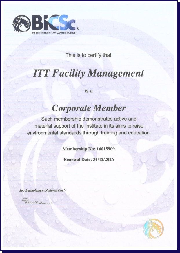 BICSc is the UK’s leading independent professional body for the cleaning industry, setting the benchmark for operational excellence. Through internationally recognized standards, it delivers robust frameworks for training, safe working practices, and consistent methodologies that elevate service quality. By driving professionalism, compliance, and continuous improvement, BICSc enables organizations to achieve dependable performance and enhanced credibility across cleaning environments. Alignment with BICSc places ITT Facility Management in a strong strategic position, reinforcing its commitment to best practice, compliance, and service excellence while strengthening client confidence and supporting consistent, high-quality delivery.